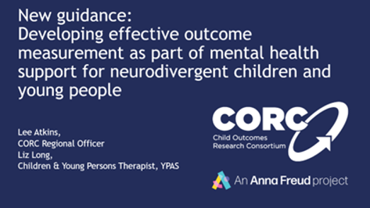 In the last session of the day, Lee Atkins, CORC Regional Improvement Officer, and Liz Long, a children and young people’s therapist at YPAS, talked attendees through new guidance for Using outcome measures effectively with neurodivergent children and young people. Liz, part of the working group that informed this guidance, is herself autistic, and she shared the challenges she experiences in her practice and the time it takes to go through measures and make them meaningful for neurodivergent children and young people - so they can experience the benefits, and so their outcomes are captured in the evidence and research base.