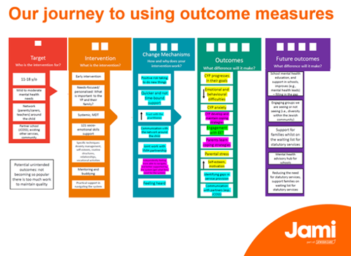 Mya Goschalk and colleagues from Jami (part of Jewish Care) described their work with CORC to create a logic model, and their journey in using different outcome measures. Mya spoke of the value of being able to “bring back the research and impact data to our staff team to inform best practice going forward and be more relevant to our children and young people.”