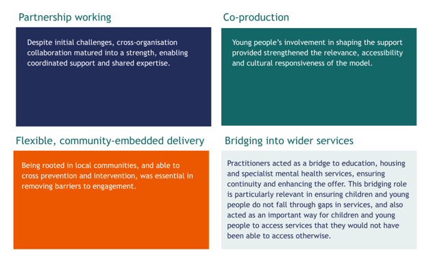 The findings from our evaluation offer transferable learning that mental health services can apply to strengthen support for children and young people facing complex social adversities. The uncovering of previously unmet neurodevelopmental, speech and language, learning, and mental health needs, particularly among marginalised groups, demonstrates the importance of proactive, multidisciplinary assessment models that can bridge gaps often created by structural inequalities. Additionally, the success of partnership working, co production with young people, flexible community based delivery, and strong bridging roles into wider services points to approaches that mental health systems across the UK could apply to improve continuity, accessibility, and cultural responsiveness.